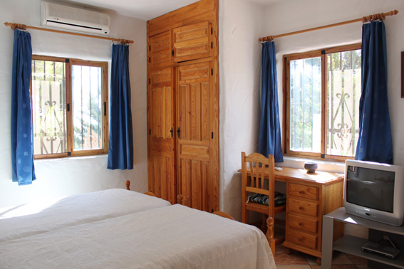 Beide Schlafzimmer haben einen eingebauten Kleiderschrank mit Kleiderstange und Schubladen sowie jeweils eine Klimaanlage. Im obersten Teil des Schrankes können Koffer und andere größere Gegenstände verstaut werden.