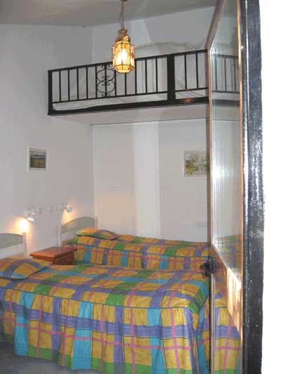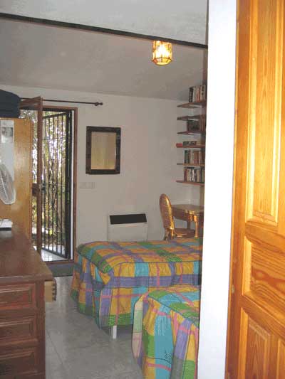 Es hat 2 Betten mit je einem Nachttisch und jeweils einer Leselampe; dazu einen Kleiderschrank, einen Schreibtisch mit Stuhl und eine castellano-Kommode mit 4 Türen und Schubfächern. Im Hintergrund des Gartenzimmers finden Sie einen durch ein schmiedeeisernes Geländer abgesicherten Hängeboden; er bietet sich zur Lagerung von Koffern an. Beide Räume haben eine E-Heizung, das Gartenzimmer besitzt eine Klimaanlage. Die Außenleuchte wird vom 2. Schalter neben der Tür von innen bedient und möglichst vor der Dunkelheit eingeschaltet, damit das Auffinden in der Nacht leichter wird! An der Wand zum Eßraum (links) hängt ein Bücherregal, das eine Auswahl an deutscher, spanischer sowie englischer Lektüre enthält und zum Lesen einläd. In der casa azul, dem Blauen Haus, findet sich eine reichhaltigere Auswahl von Büchern, im Kaminzimmer eine ganz kleine, die Kochbücher befinden sich in der Küche.